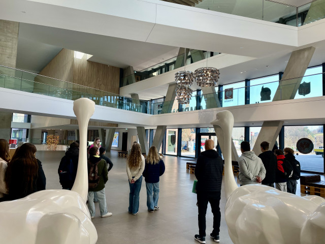 Zwei Studentinnen von STRAUSS begrüßten die beiden Schulklassen in der großen Empfangshalle des Campusgebäudes. Der Workwear-Hersteller STRAUSS stellt Arbeits- und Berufskleidung her und bietet ein breites Angebot an Ausbildungsberufen, Praktika für Schüler/-innen, Ausbildungsberufen, Dualen Studiengängen sowie einem Inhouse-Studiengang an. „Ich habe zur Orientierung ein Praktikum bei STRAUSS gemacht, und das hat so viel Spaß gemacht, dass ich mich für ein Studium hier entschieden habe“, erzählte eine der beiden Studentinnen. Beide berichteten von viel Unterstützung und Benefits seitens des Unternehmens während des Studiums.